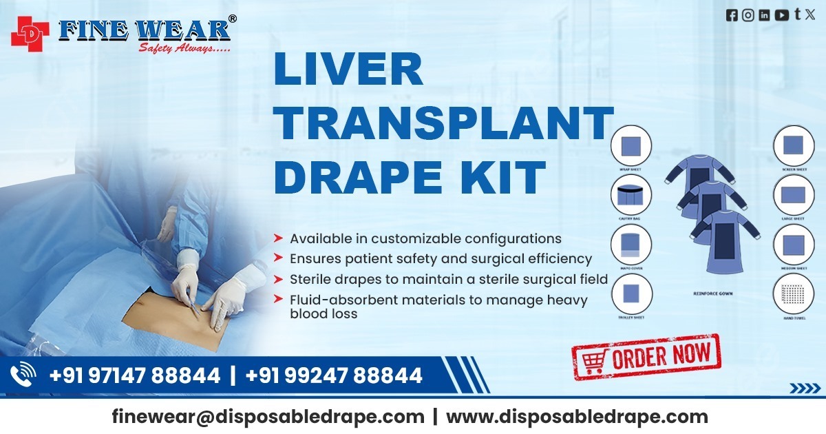 MEDICAL SURGICAL LIVER TRANSPLANT DRAPE KIT SUPPLIER IN INDIA. Dhwanit Enterprise (FINE WEAR), based in Ahmedabad, Gujarat, India, is a trusted manufacturer, exporter, and supplier of premium sterile surgical products since 2008. 🔹 Key Highlights: Advanced Sterile Protection: Ensures maximum infection control for critical liver transplant procedures, High Fluid Management: Superior absorbent materials for heavy fluid & blood control, Complete Surgical Setup: All essential drapes and accessories in one ready-to-use kit, Premium Quality Material: SMS fabric, PE film, and reinforced gown for durability & safety. Customizable Kit Options: Designed as per hospital and surgical requirements. Efficient Workflow: Saves operation time with organized sterile components. Global Standards Compliance: Manufactured under strict quality & sterilization protocols. 🔹 Standard Kit Includes: Reinforced Gown – 3 pcs. Hand Towels – 3 pcs. Large Sheet – 1 pc. Screen Sheet – 1 pc. Medium Sheets – 4 pcs. Trolley Sheet – 1 pc. Mayo Cover – 1 pc. Cautery Bag – 1 pc. Wrap Sheet – 1 pc. 🔹 Applications: Liver Transplant Surgeries, Complex Hepatic & Abdominal Procedures. 👉 Reliable. Sterile. Procedure-Ready. Your trusted partner for high-performance surgical drape solutions. For more inquiry, Please visit our website: WWW.disposabledrape.com